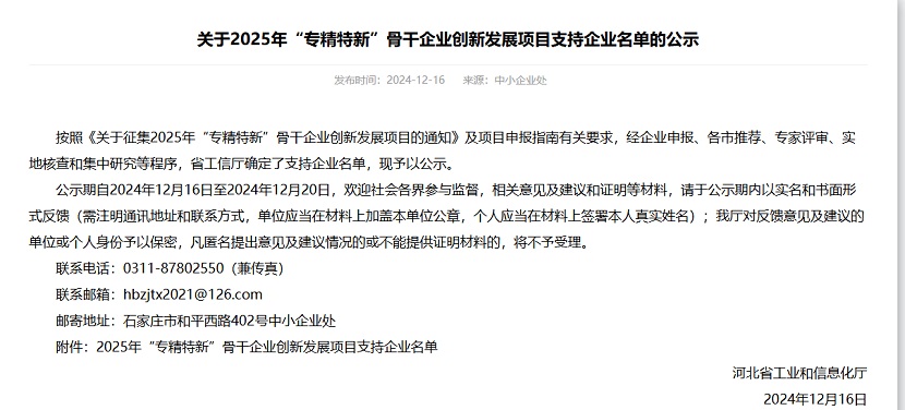 近日,公司憑借在專(zhuān)業(yè)領(lǐng)域內(nèi)的持續(xù)深耕與創(chuàng)新,再度榮獲河北省“專(zhuān)精特新”示范企業(yè)認(rèn)定。這一榮譽(yù)的再次獲得,不僅是對(duì)公司長(zhǎng)期以來(lái)堅(jiān)持專(zhuān)業(yè)化、精細(xì)化、特色化、新穎化發(fā)展道路的肯定,更是對(duì)公司不斷創(chuàng)新、追求卓越精神的認(rèn)可。